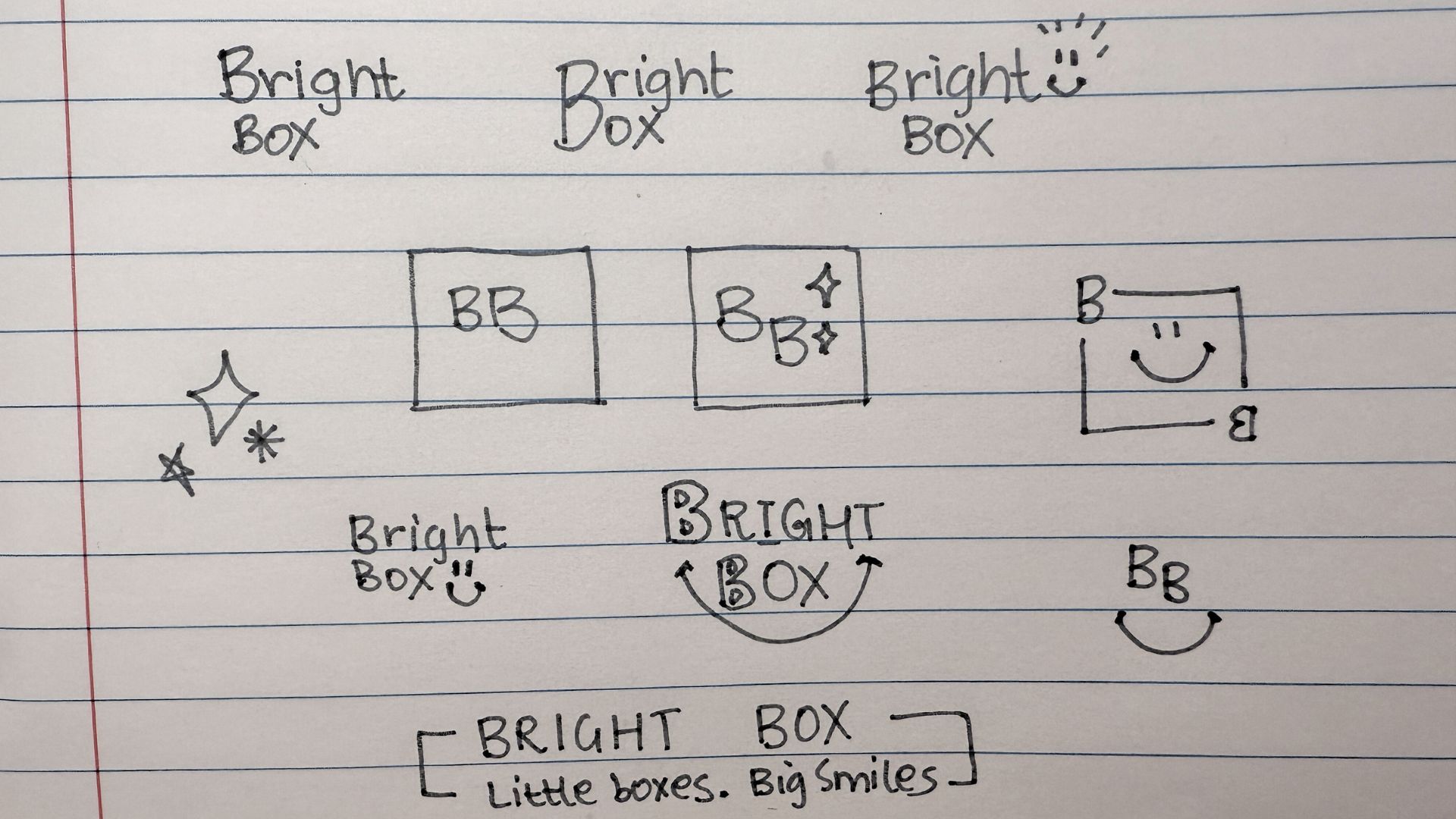 Initial sketches explored potential logo concepts, supporting elements and typography directions. Because BrightBox is a new start-up, the brand name needed to be the hero, thus ensuring strong visibility, awareness and easy recognition from the outset. I also experimented with playful elements like smile curves and subtle smiley motifs to reinforce the tagline "Little Boxes. Big Smiles."